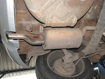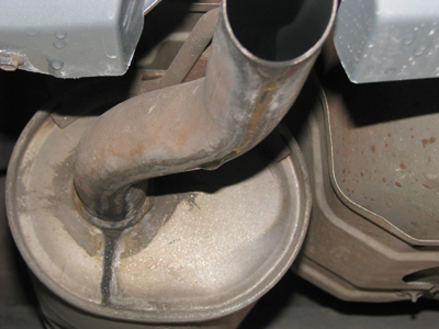 5) Conjunto traseiro ou silencioso traseiro: Componente responsável por diminuir os ruídos graves provocados pelo funcionamento do motor. Veículos que andam por períodos curtos de funcionamento tendem a acumular água em seu interior.